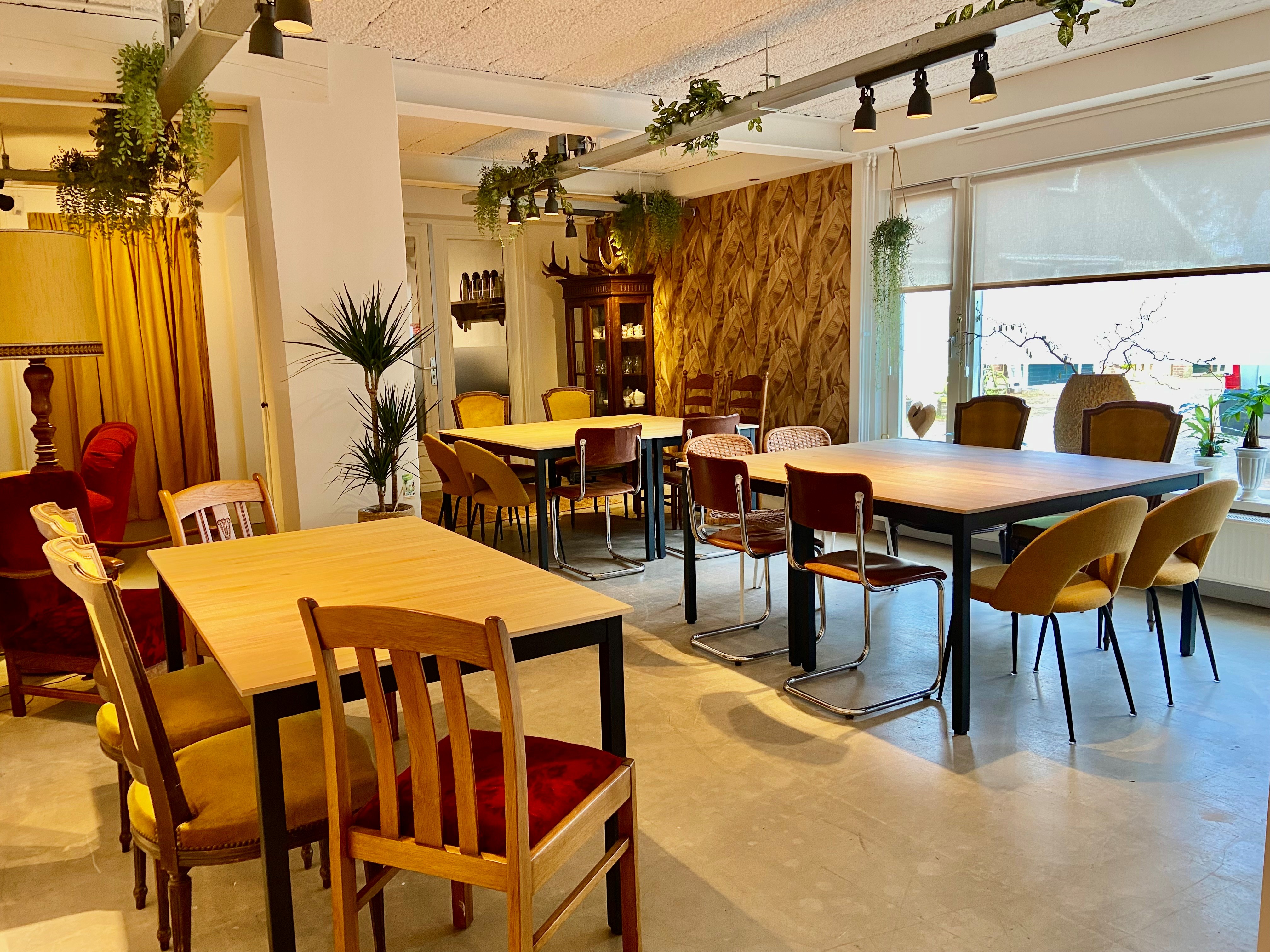 De ruimte is flexibel in te delen door het verplaatsen van tafels en stoelen, of door deze tijdelijk op te bergen in de opslagruimte.